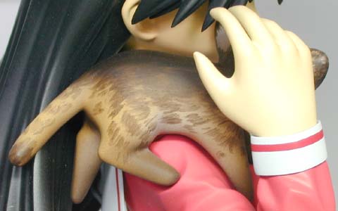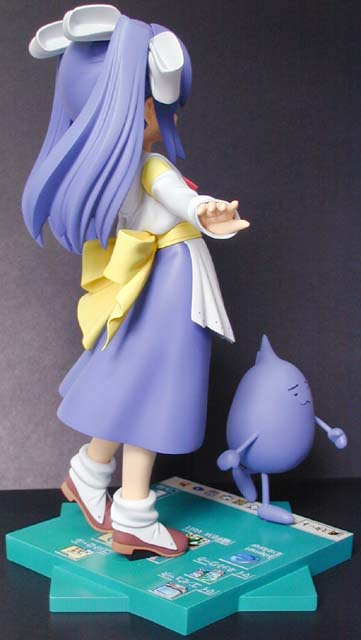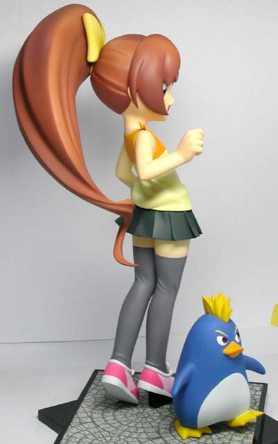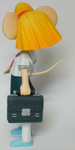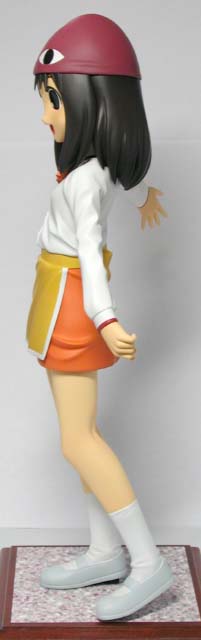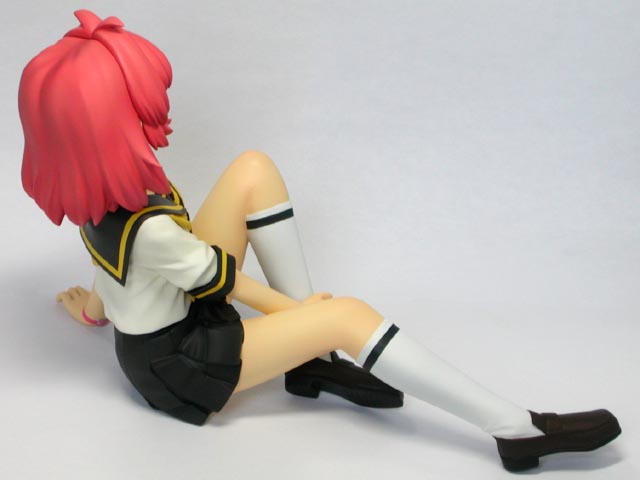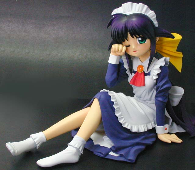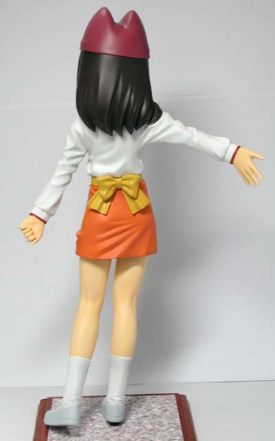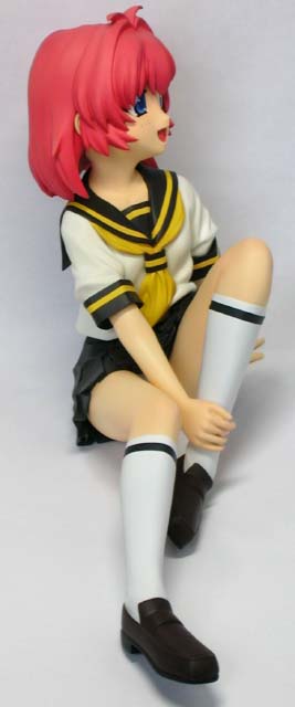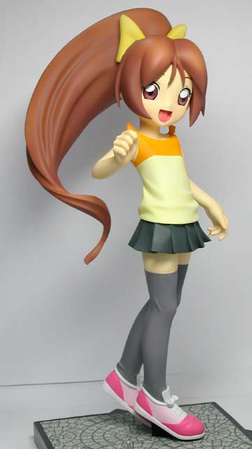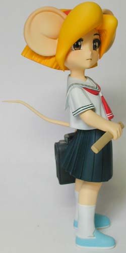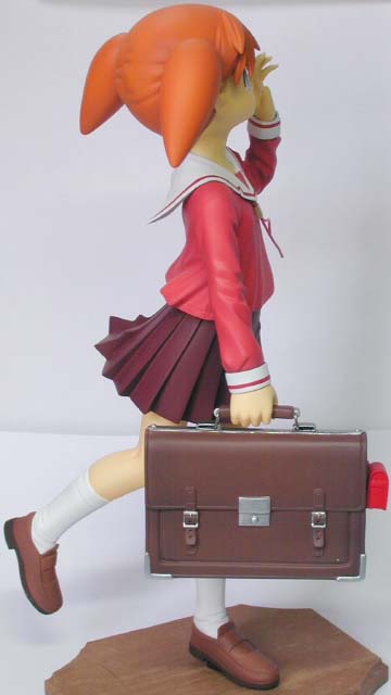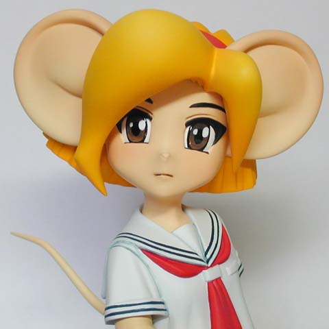 ←ステレオ写真です。完成日:2000/10/19 スケール:1/6(19.0cm) パーツ数:23(スタンド無し)(メガネはプラ板・真鍮線より工作。プラ板・真鍮線がが添付されます) …。 「ニャにがどうニャってるんですニャ〜〜!?」 いやまぁ。作った動気は、これだけですな(^_^;)。猫、好きなもんで。 状況が室内なので、ソックス。これもポイント高いですな。 髪の毛とスカートの解釈に難儀しましたが。髪の毛、逃げずに作り込んでよかったと思ってます。キャラの雰囲気と困った感じも出ましたし(^_^;)。