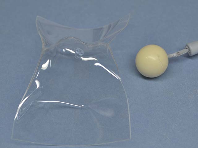 2cmの玉を棒に固定して。名刺サイズの0.3mm透明プラ板をあぶって押しつけます。