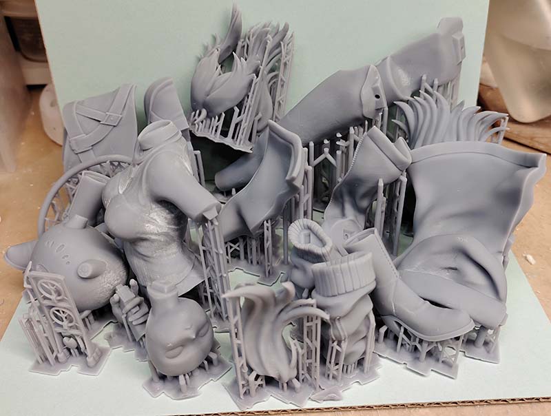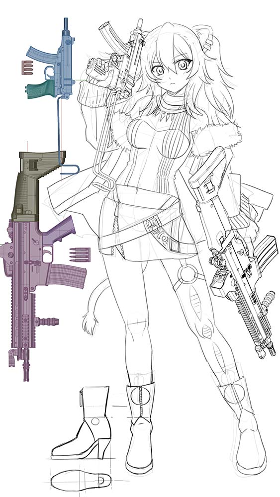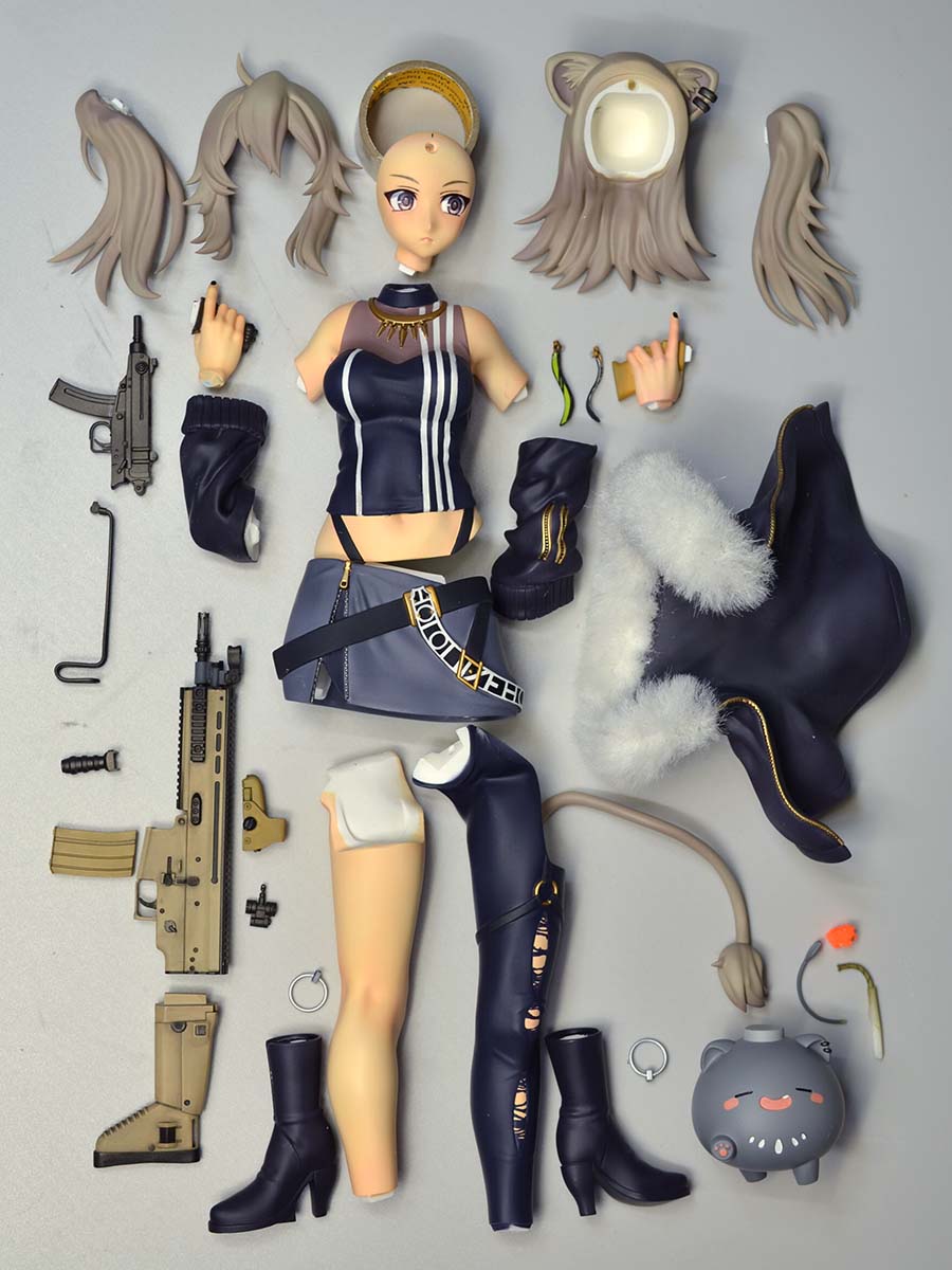 髪の毛。白かと思っていたけど、思ってたより麦わら色でした。 黒の部分…黒に見えて、3種類くらい調色しています。ダークブルーからダークブラウン 瞳デカールの他に、ベルトの「HOLOLIVE」ロゴ、左袖のファスナーのストラップがデカールとして付きます。 スカートのベルトのロゴはモールドにしようかとも思ったのですが。こういうものって普通は印刷だよな…ってことでデカールに。 VZ61スコーピオンのストックは、ステンレス線が付属します。 ただ、このステンレス線がかなり堅いので、一度焼き鈍ししてから使っていただくことになります(ガスコンロで赤熱するくらいあぶって、自然冷却)。真鍮線でも試したのですが、こちらは逆に柔らかすぎたので没です。 曲げるときのための治具も付属しますが。曲げるためというより寸法確認用です。実際に曲げるにはプライヤー等を使ってください。 SRRBの導火線の火花は、パーツとしてはつきません。食器洗い用のスポンジをちぎって、蛍光オレンジで塗ったものです。